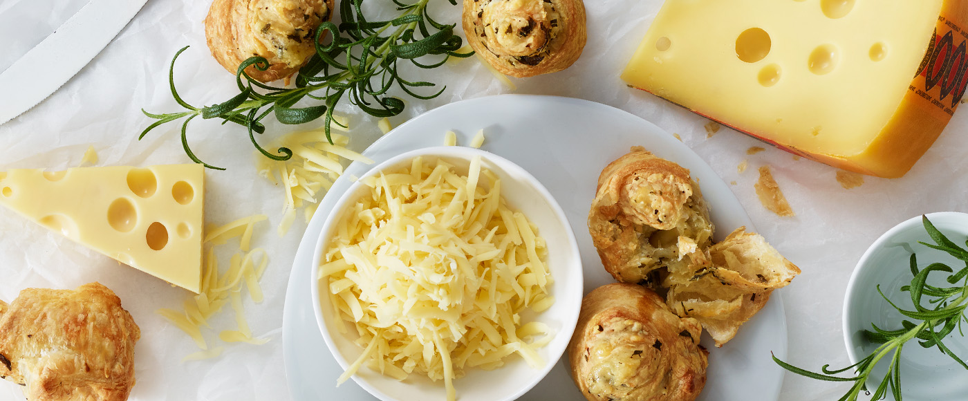 Fordel revet Jarlsberg®, rosmarin, salt og peber jævnt over dejen, og rul den sammen som til kanelsnegle.