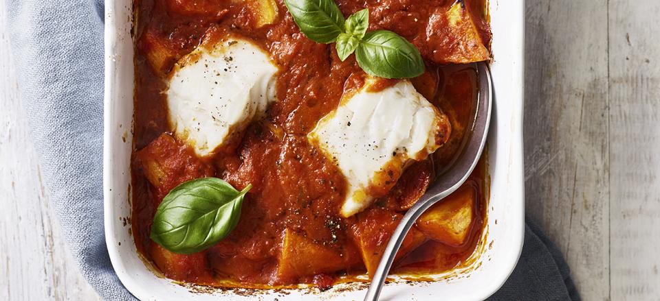 Tag fadet med kartofler ud af ovnen, og kom fisken i fadet.
