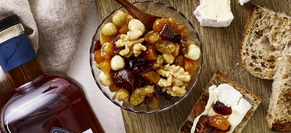 Bland honning op med cognac, og hæld det over frugtblandingen.