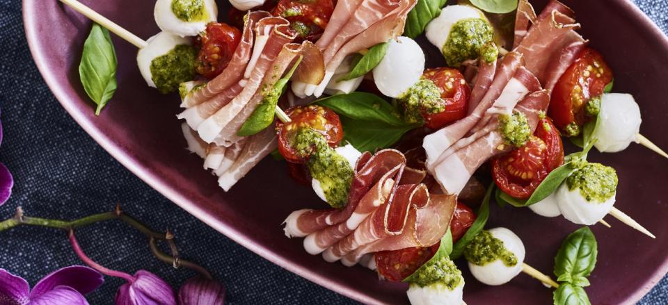 Kom de bagte tomater på bambusspyd med minimozzarella og parmaskinke.