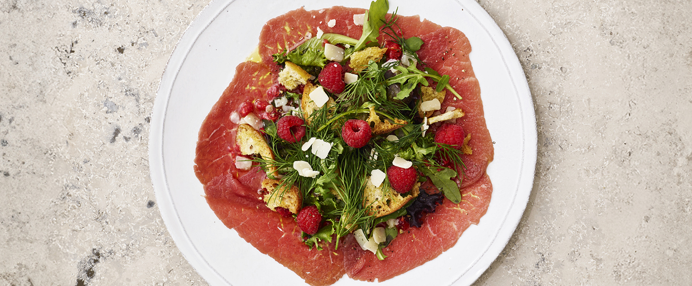 Carpaccio med parmesan, sprødt brød og hindbærvinaigrette