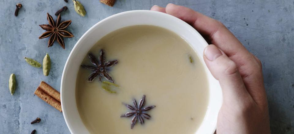 Hæld mælken gennem en sigte og bland med rom og varm te.