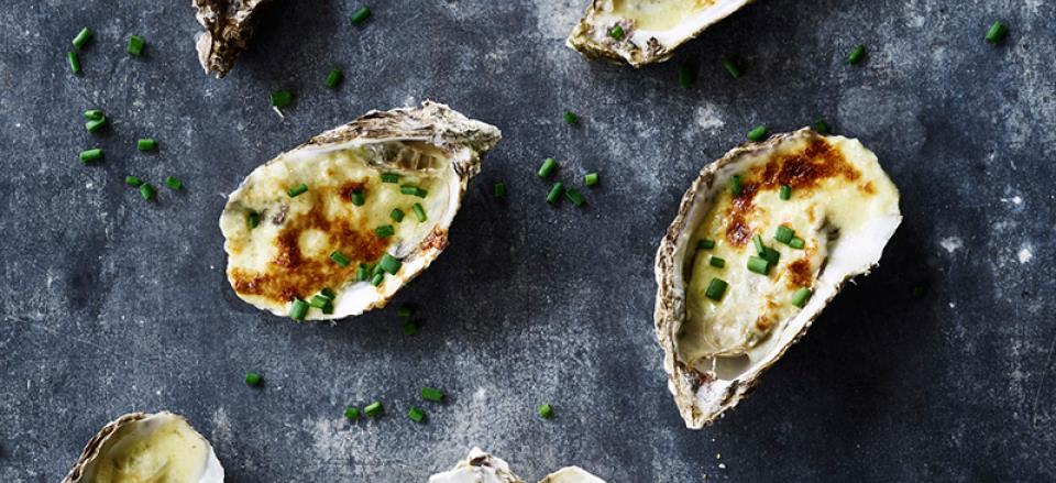 Læg de åbne østers i en bradepande og kom en skefuld sauce over hver.