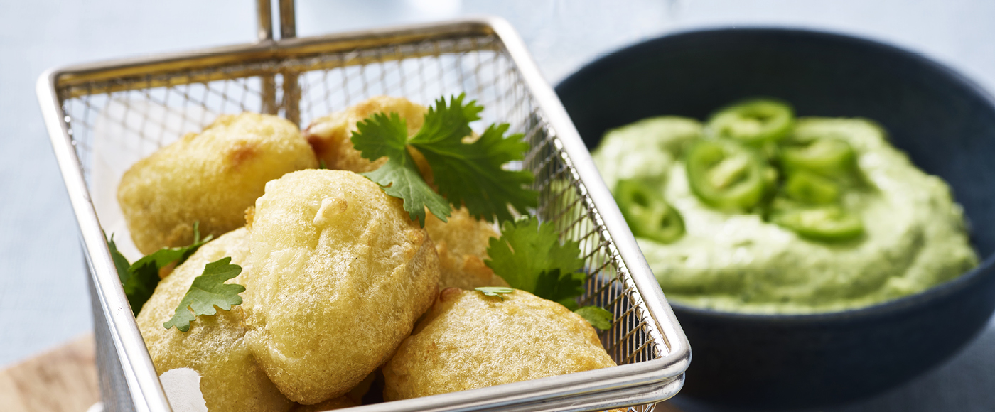 Chili cheese nuggets med spicy grøn proteindip