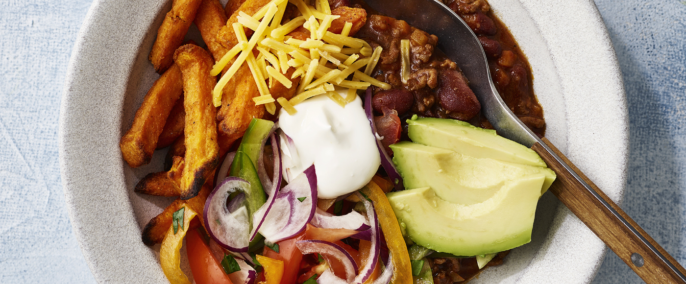 Servér chilien med sweet potato fries, peberfrugtsalat og avocado samt lidt cremefraiche og drys med cheddarost.