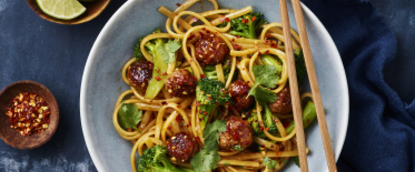 Servér med kødbollerne og drys med sesamfrø, chiliflager og evt. frisk koriander.