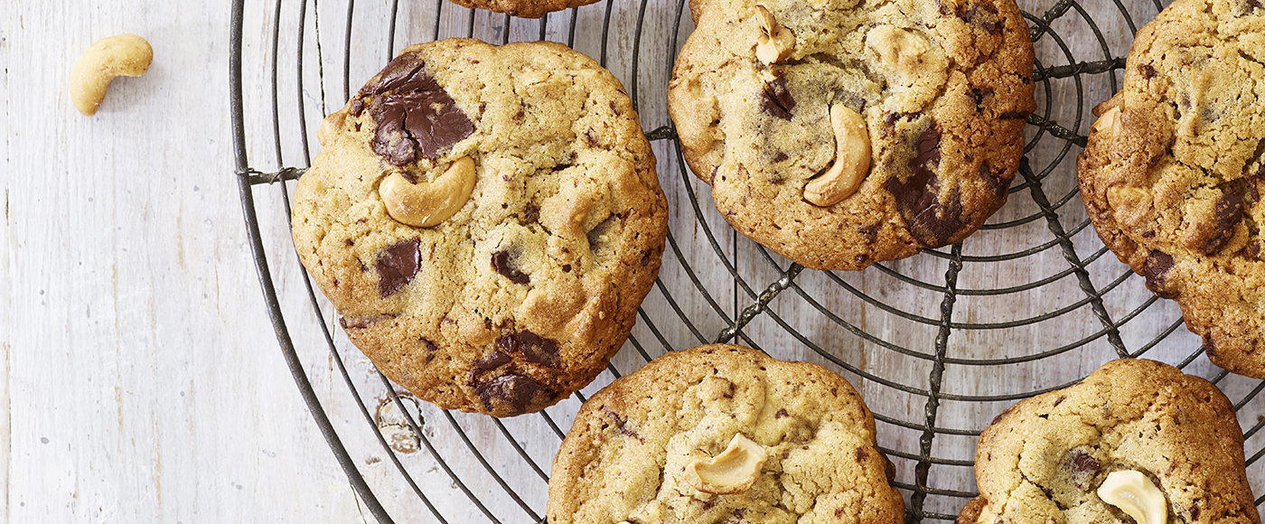 Hak chokolade og cashewnødder groft, og rør dem i dejen.