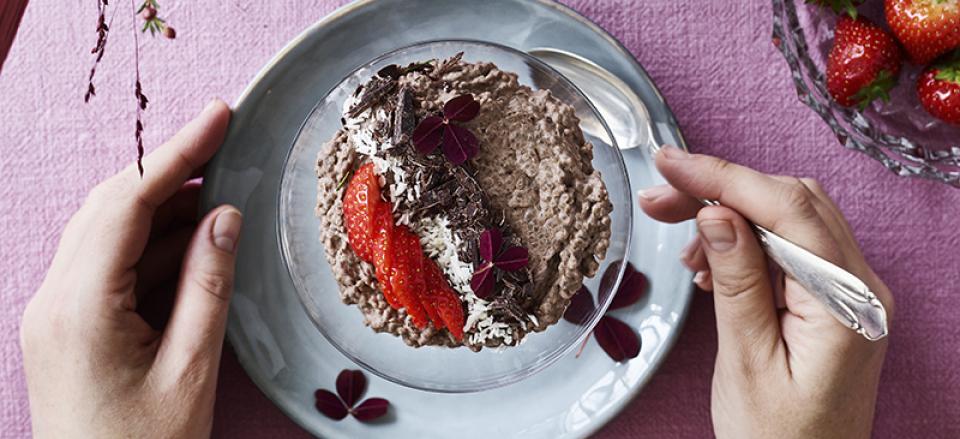 Nu er chiafrøene svulmet op og har tyknet desserten.