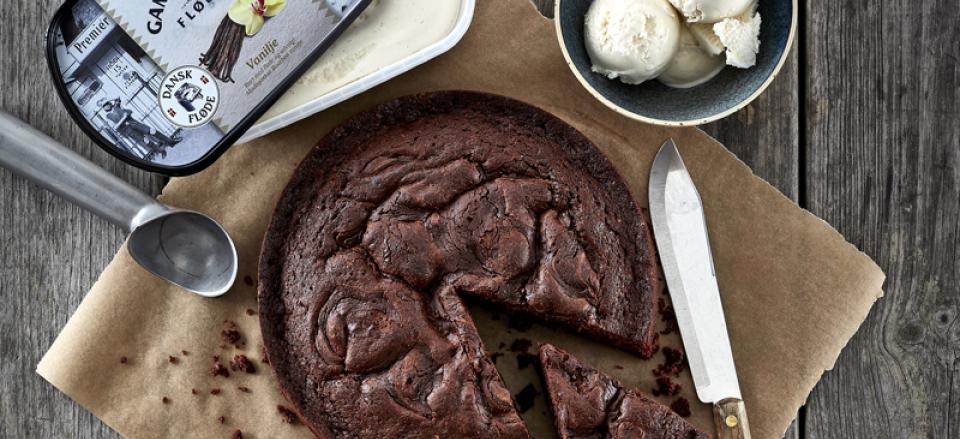 Chokoladekage bagt med vaniljeis