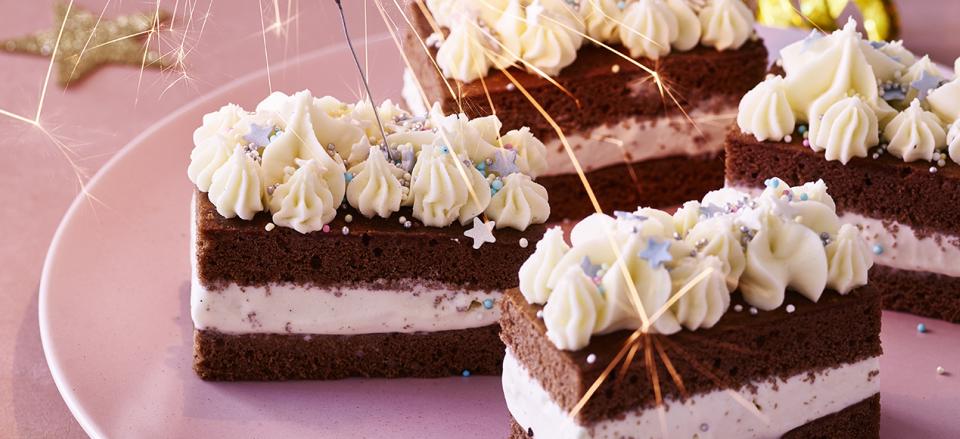 Pres det let sammen, så det bliver plant, og der ikke er huller mellem is og kage.