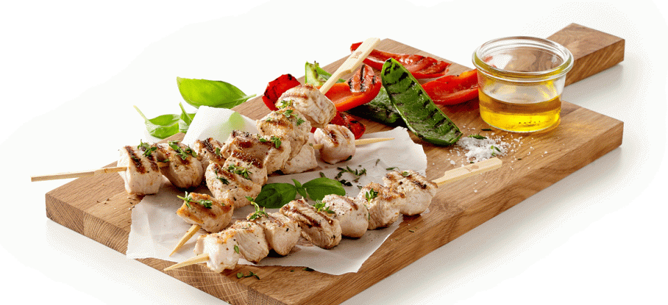 Grill stykker af peberfrugter og løg i kvarte sammen med grillspydet.