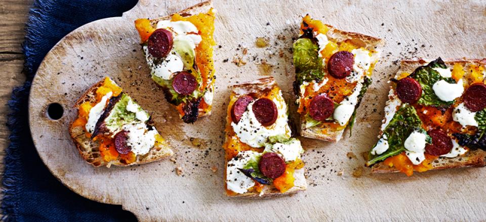 Flæk ciabattabrødet på langs og smør squashpuréen på.