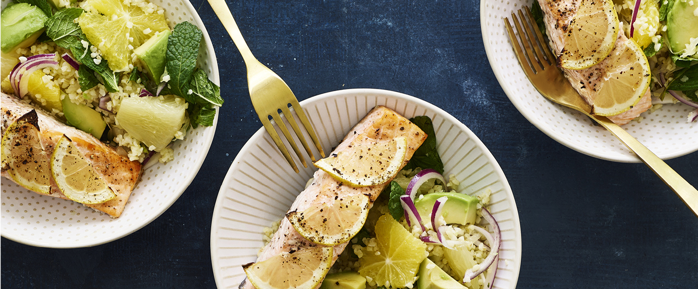 Citronbagt laks med avocado-citrussalat med bulgur