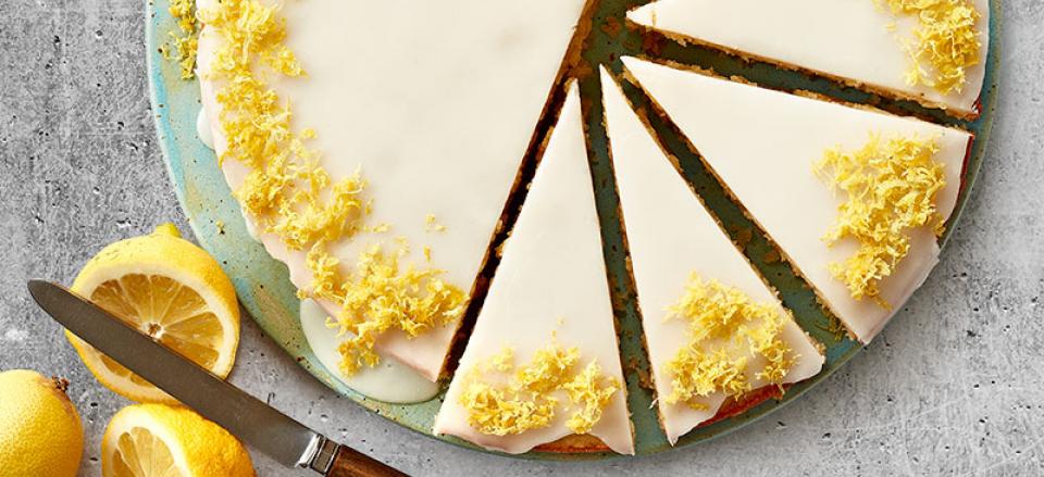 Når kagen er afkølet, smøres toppen med citronglasur.