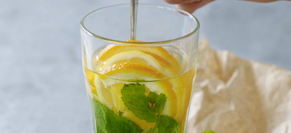 Kom citron og appelsin i et stort glas sammen med mynte og agavesirup.