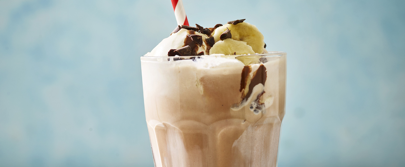 Top med banan i skiver, og afslut med chokoladesauce og chokoladespåner.