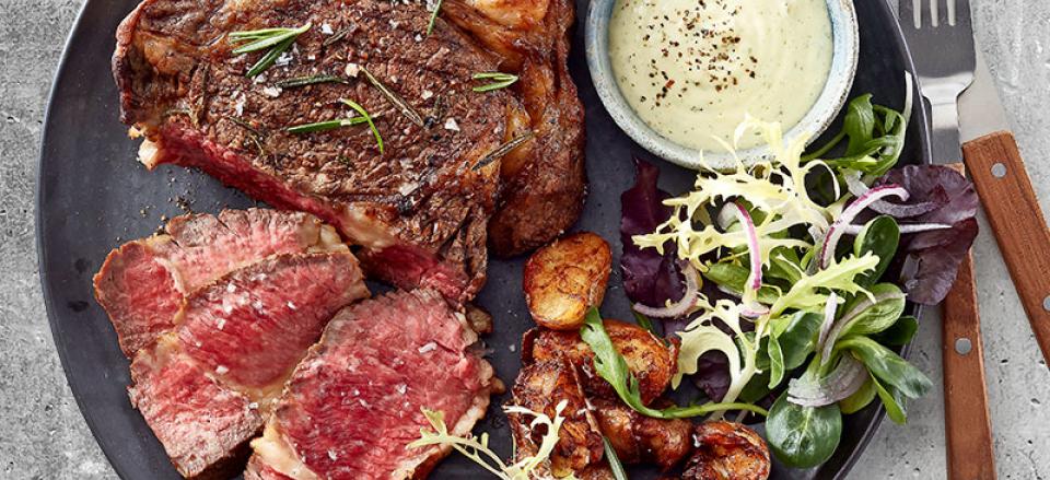 Côte de Boeuf med sprøde kartofler, grøn salat og estragonmayonnaise