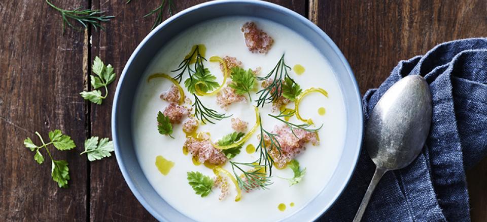 Cremet blomkålssuppe med stenbiderrogn, citronolie og plukkede urter