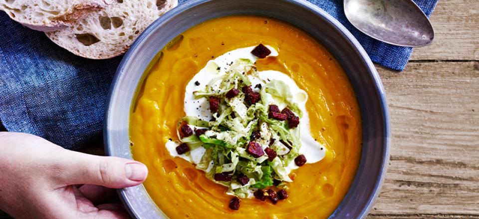 Server suppen med en klat cremefraiche samt ristet chorizo, kål og lunt ciabattabrød.