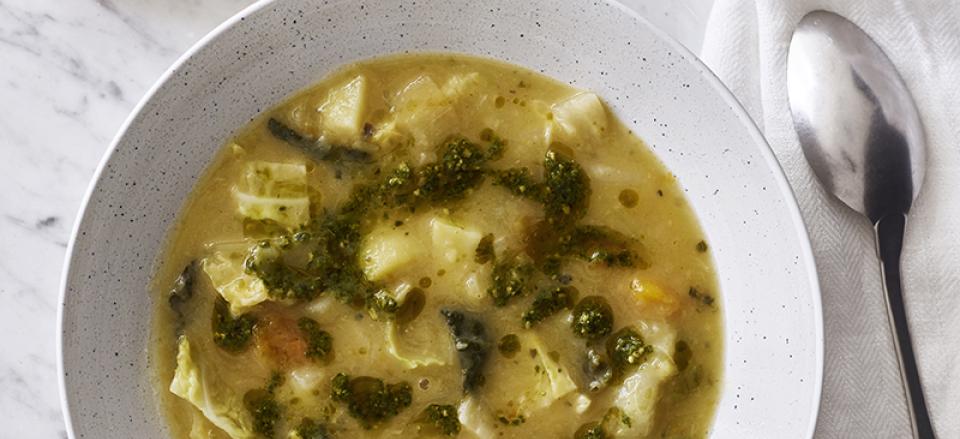Cremet kål- og kartoffelsuppe med græskar og pesto