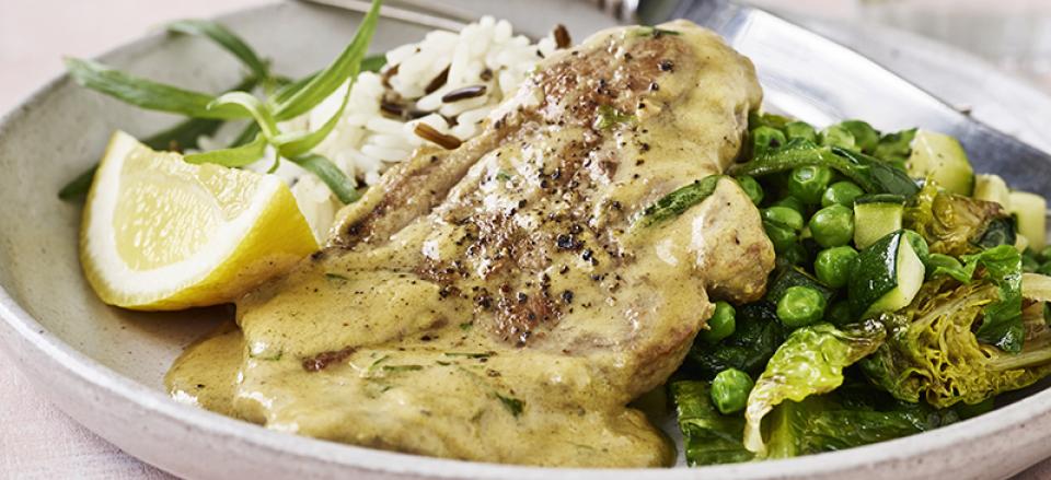 Cremet sennepsgris med estragon, ris og lun ærtesalat