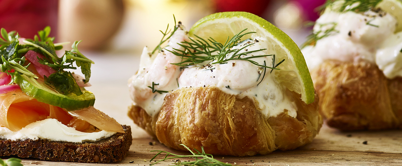 Skær et snit ned langs toppen af hver croissant, og fyld rejesalaten i.