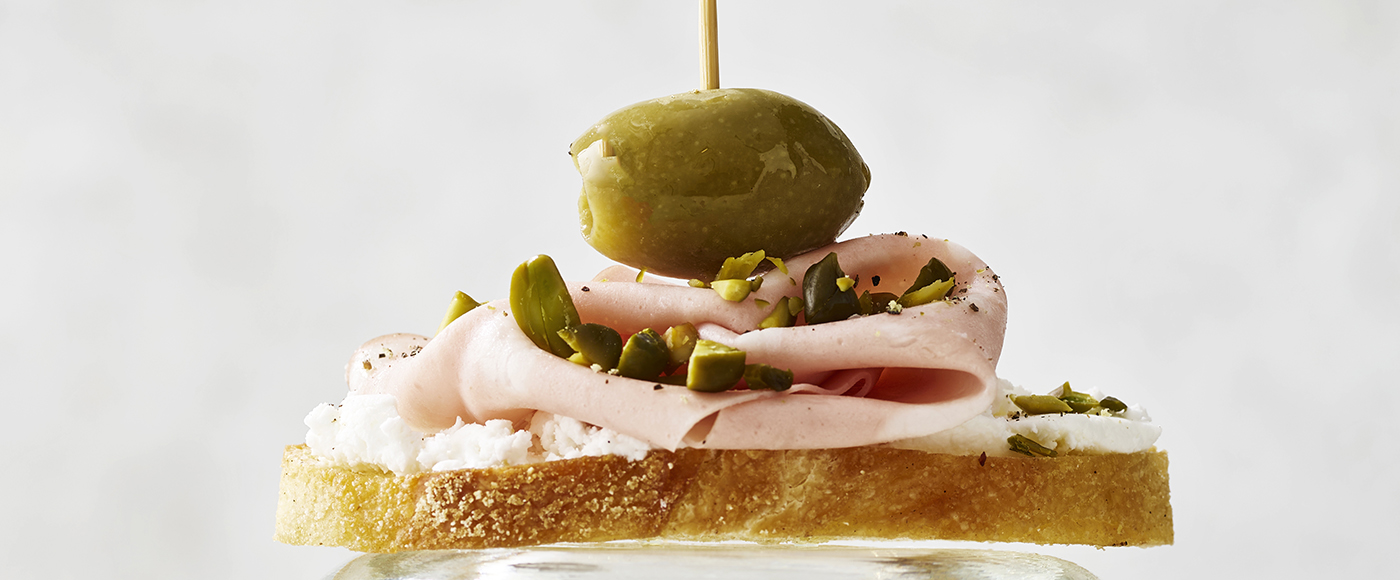 Crostini med gedefriskost, mortadella og pistacienødder