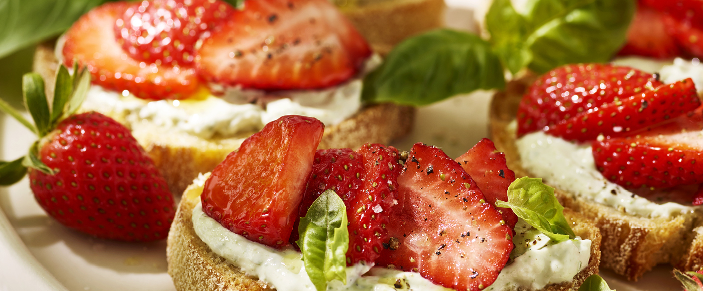 Crostini med gedeost, basilikum og jordbær