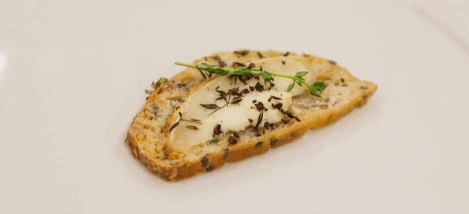 Crouton med gedeost toppet med revet Toms Ekstra 80%