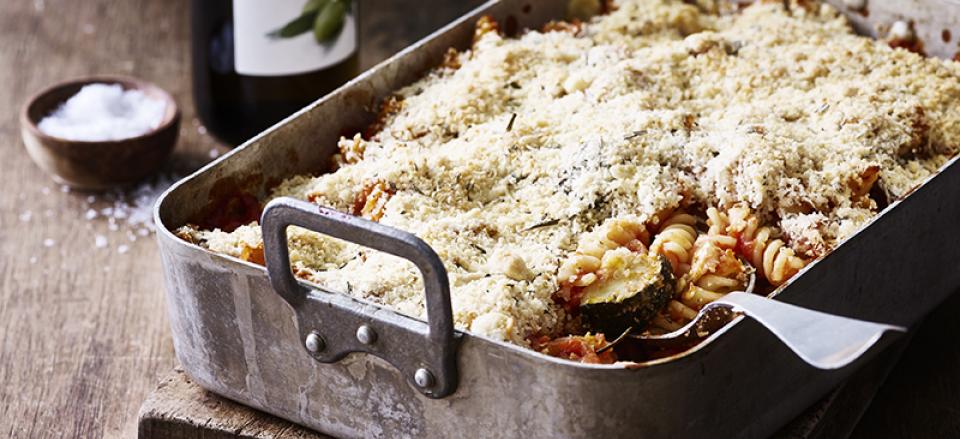 Crumble med pasta og ratatouille