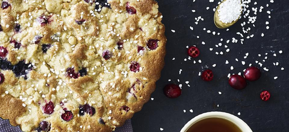 Crumblekage med blåbær, tranebær og brunet smør