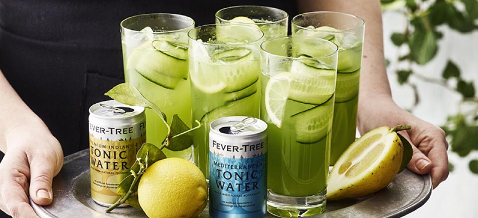 Kom gin i, fyld op med isterninger, agurkeskræller og citronskiver.