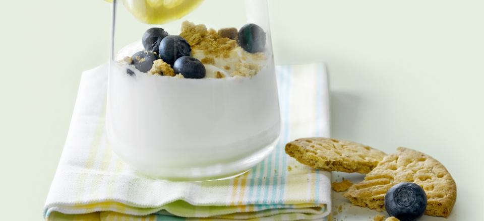 Hæld de knuste digestivekiks i sammen med lidt blåbær.