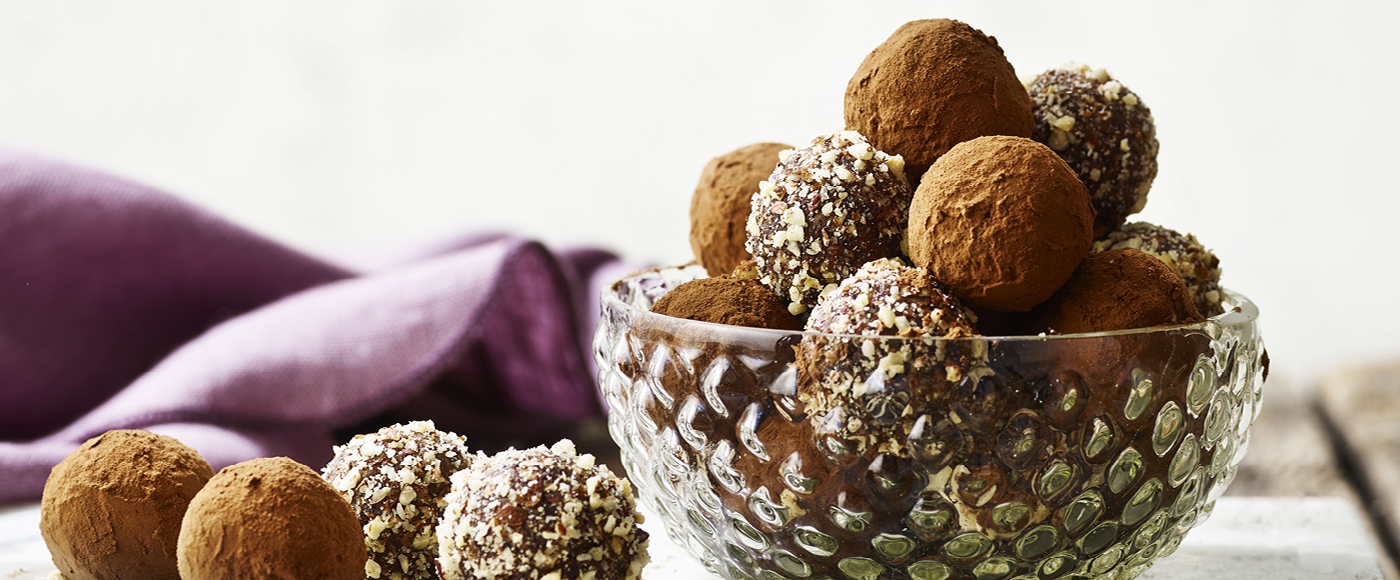 Kom dadler, 1 spsk. kakao, appelsinskal- og saft, mørk chokolade, 50 g hasselnødder og havregryn i en foodprocessor og hak det sammen til en ensartet masse.