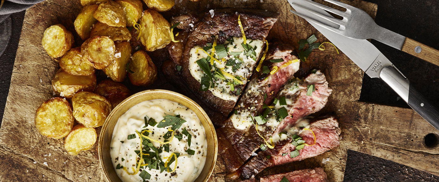 Entrecote med estragon-citron aioli og ovnstegte små kartofler