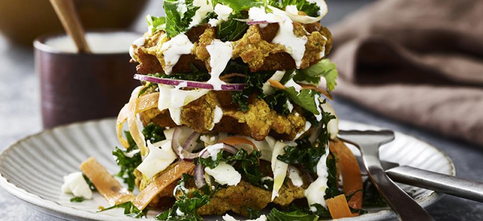 Top vaflerne med grøntsager, lidt yoghurt og et drys persille og koriander.