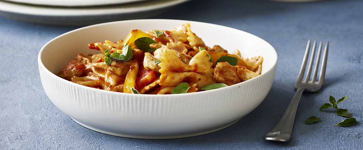 Farfalle med pesto rosso, kylling og peberfrugt