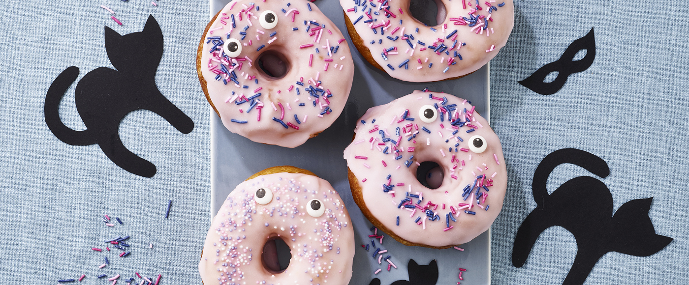 Dyp den ene side af hver donuts i glasur og pynt med krymmel og evt. sukkerøjne.
