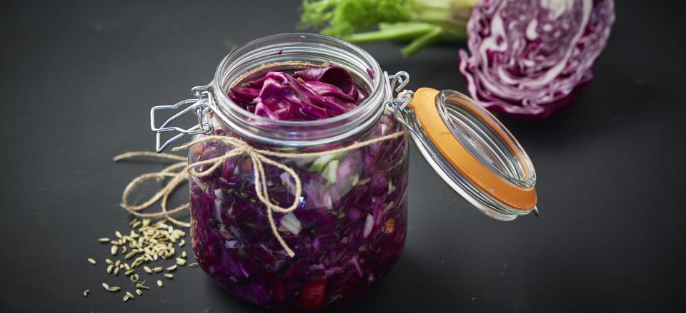 Pres kålblandingen tæt sammen i glasset, så den er dækket af væske.