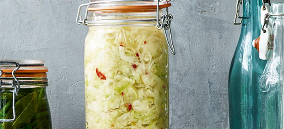 Pak kålen tæt i et sylteglas og hæld væden over.