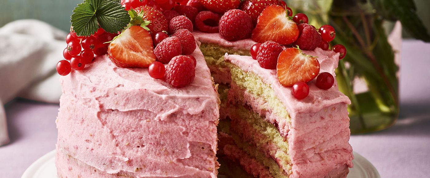 Top med den sidste kagebund, og smør den gemte andel af cremen på toppen og ydersiden i et tyndt lag – man må gerne kunne se kagebundene gennem cremen.