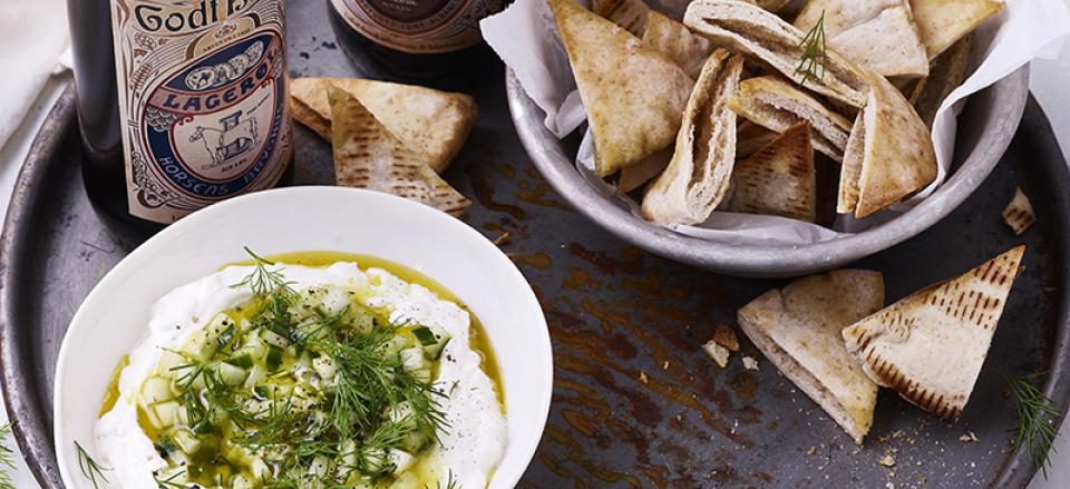 Del pitabrødene i 6 stykker hver, og rist dem sprøde i ovnen i 10 min. ved 200°C.