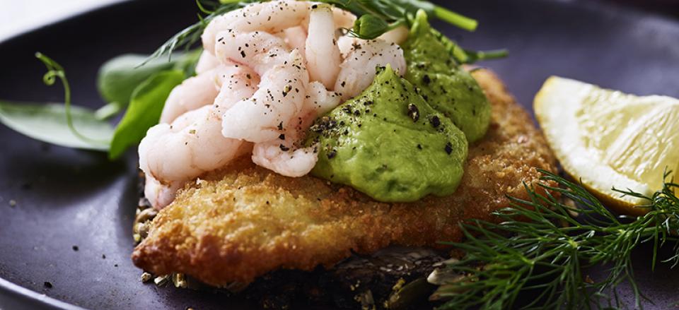 Fiskefilet med avocadomayo, dild og rejer