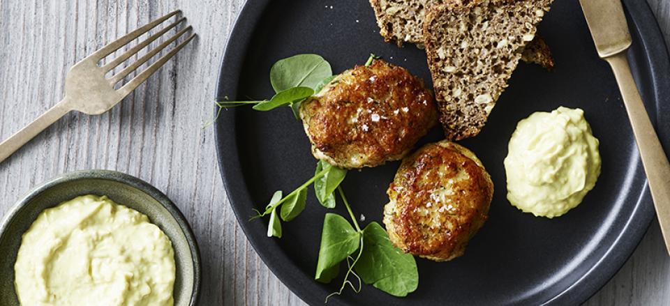 Skær hellefisk i små tern og vend i fisken sammen med groftrevet løg, mel, æg og mælk.