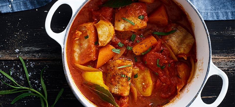 Skær torsken i grove stykker og kom i gryden. Lad fisken simre med i 5 minutter.