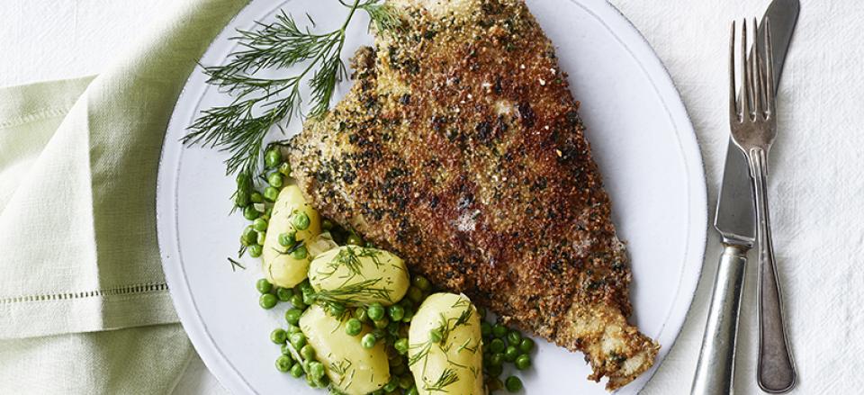 Flået rødspætte med urtepanering og lun kartoffelsalat med ærter