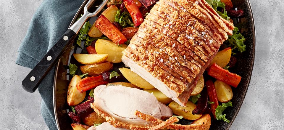 Flæskesteg med rodfrugter i fad