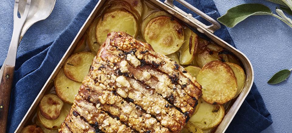 Flæskesteg med rosmarin, salvie og hvidløg på kartoffelbund
