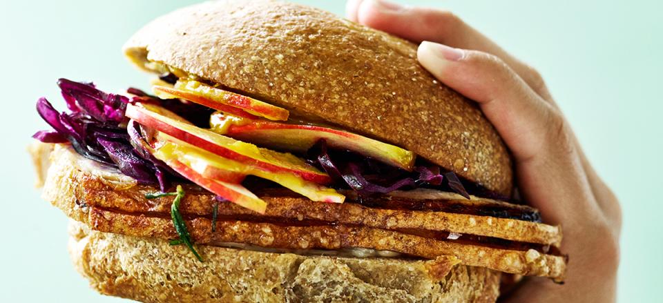 Læg hver bolle sammen med rødkålssalat, ribbenssteg og æble.