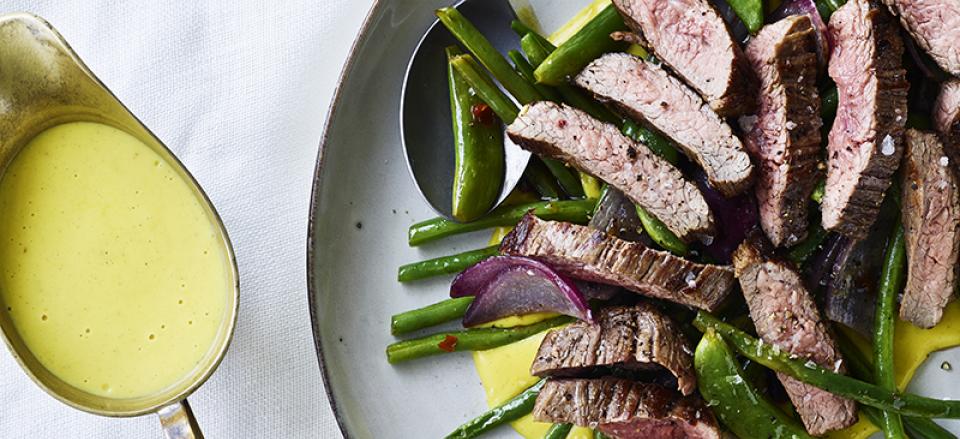 Lav saucen efter pakkens anvisning og server i fad med grøntsager og kød.